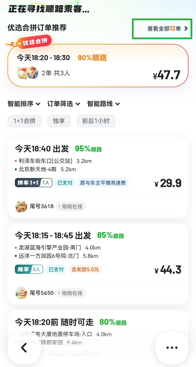 此外,顺路订单推荐列表也越来越人性化,比如乘客的顺路车主推荐列表,不仅可以看到每位车主的顺路程度、好评率、接单次数,还可以看到车主几分钟在寻找乘客。同时,支持根据“距我最近”、“最早出发”、“出行最多”等逻辑进行订单智能排序。