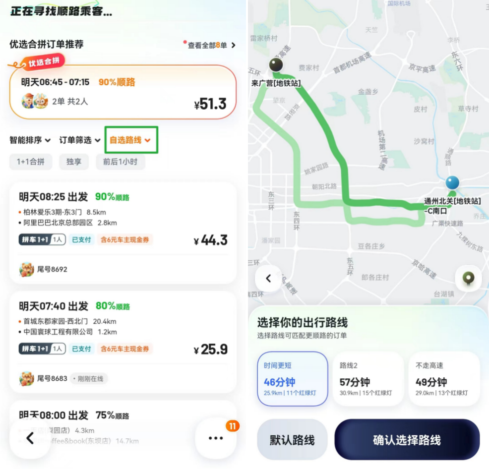 过去,平台在为顺风车车主推荐同路人时,大多是基于默认路线,而如今,随着更多算法赋能路径规划能力升级,可以支持顺风车车主自主选择行驶路线,并根据车主选择的不同路线,推荐不同顺路乘客。这让车主从A点到B点,有更大机会遇到同路人,并且更便捷高效地将空座分享出去。